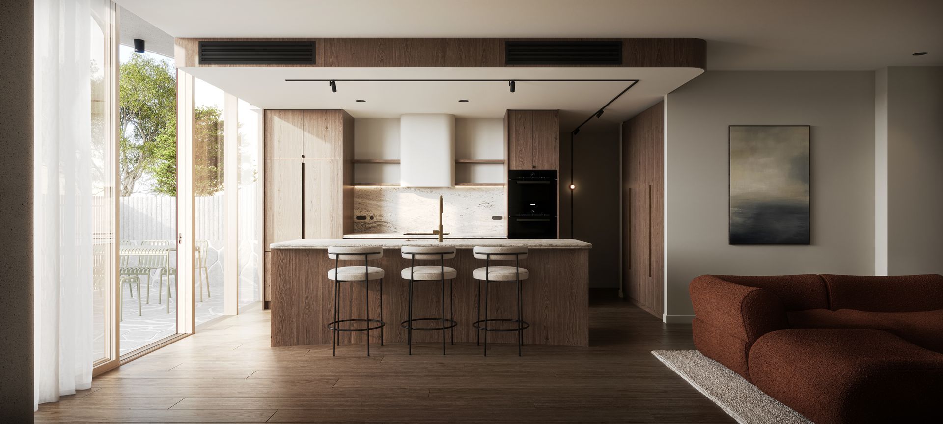 Resort living woven into every detail. Interiors shaped by curved lines, natural stone, and soft light - elements that bring a sense of calm and retreat into daily life.